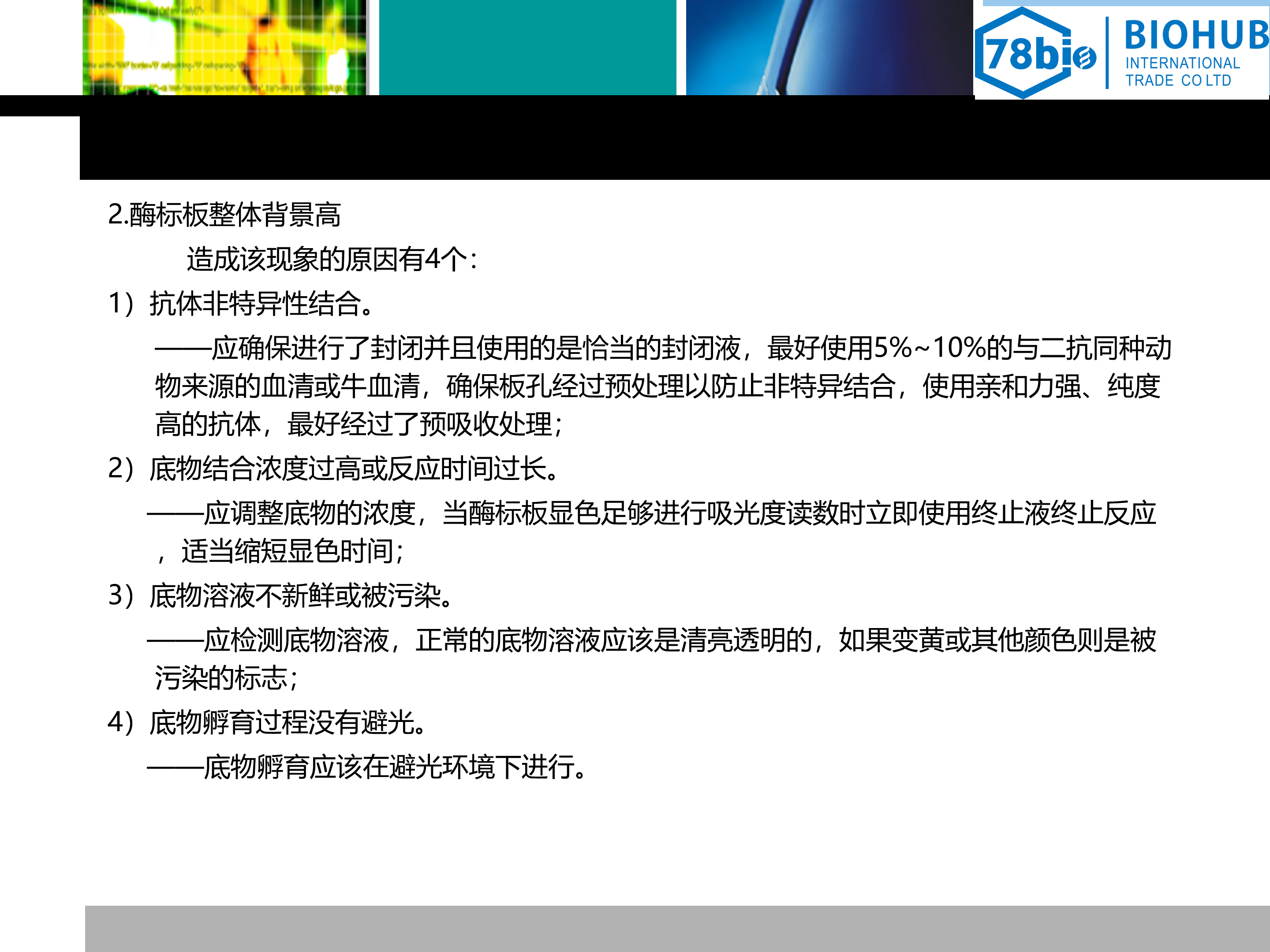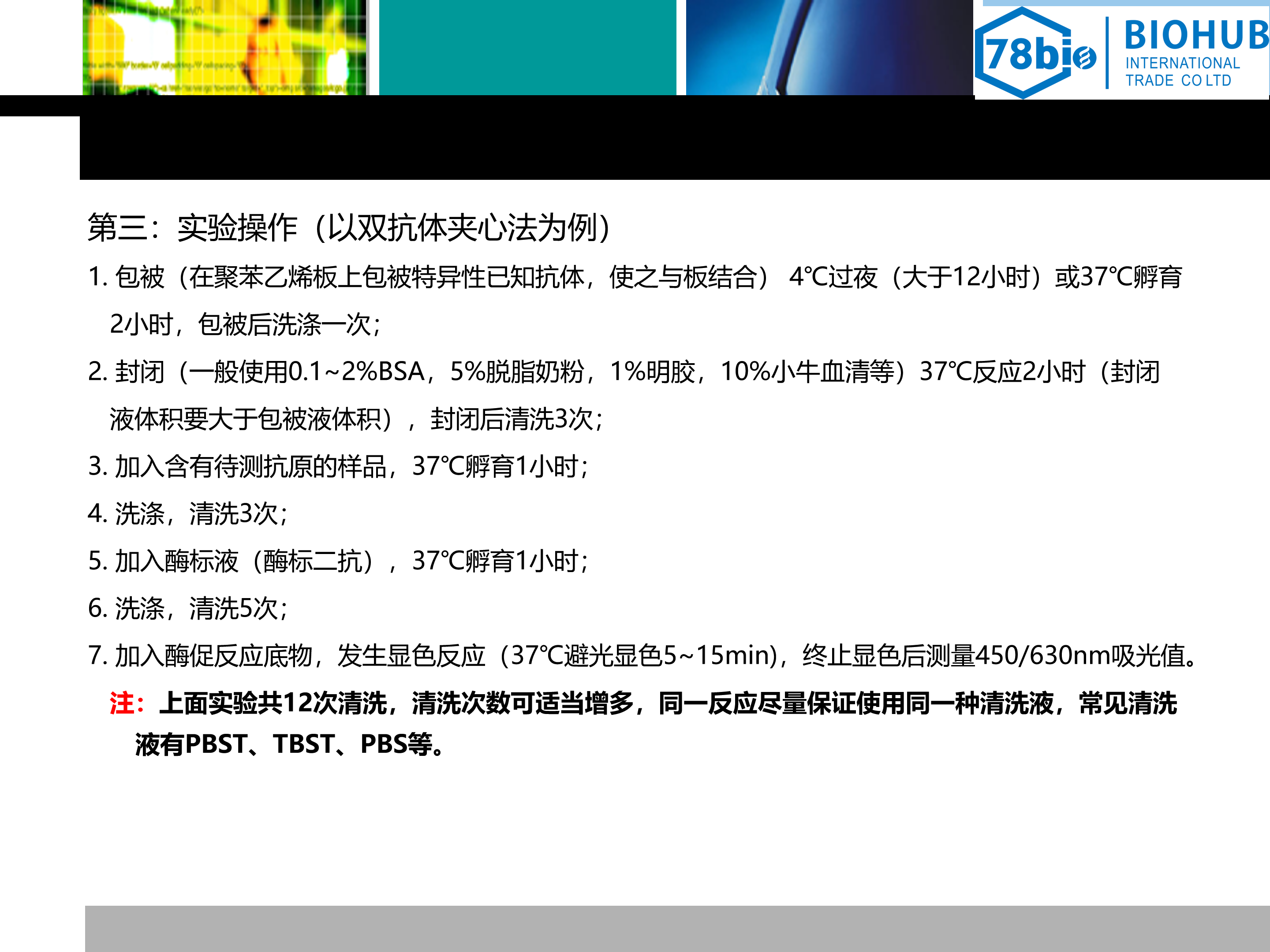 酶联免疫吸附试验(Enzyme-Linked Immunosorbnent Assay),简称ELISA,它是实验室常用的检测方法。 酶是能够催化化学反应的特殊蛋白质,其催化效力*人造催化剂,ELISA 就是将抗原和抗体的免疫反应和酶的催化反应相结合而建立的一种新技术。使用酶去标记抗原或抗体以后,既不影响抗原抗体反应的特异性,也不改变酶本身的活性。因此ELISA具有准确性高、检测时间短、价格低廉、判断结果有客观标准、结果便于记录和保存等优点,适合于大批标本的检测,广泛应用于食品安全检测、医疗检测以及免疫实验分析等领域。